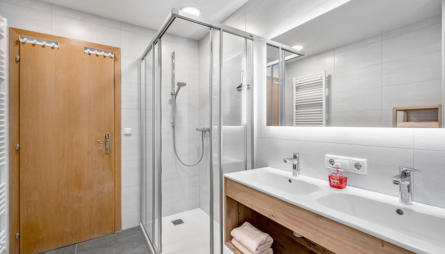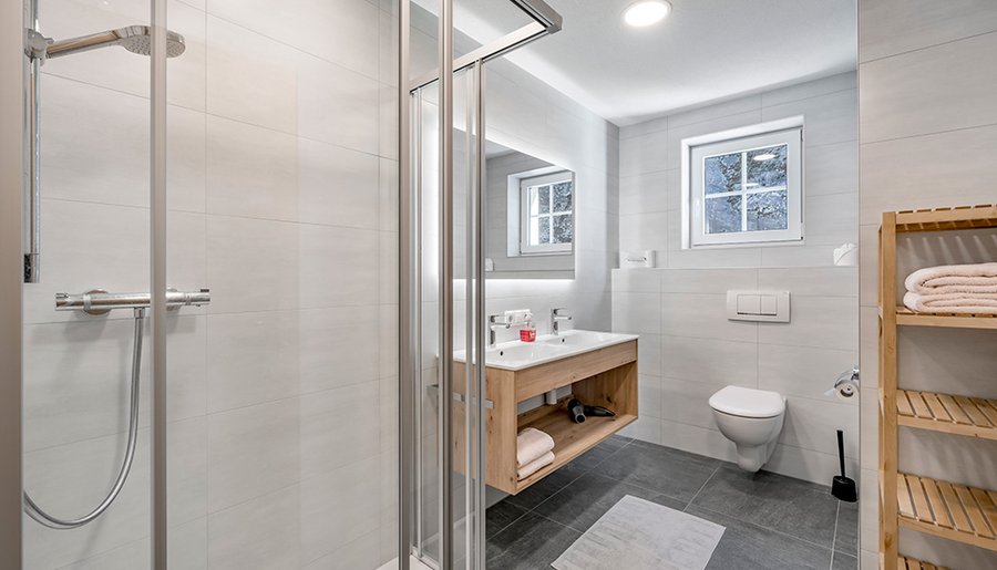 - spacious bathroom with shower, double washbasin and WC